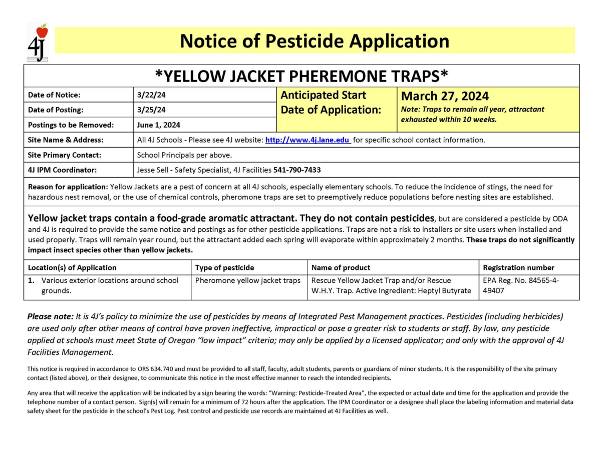 Though these traps are intrinsically safe for staff, students, and beneficial pollinators, they are considered a pesticide by ODA, and the district is required to send out notifications, just as with other pesticide applications. All schools are part of this program.